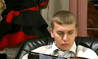 Huge titted maid fucks the virgin boy