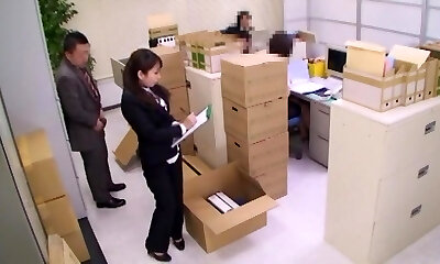 英俊的亚洲助理在放养和高跟鞋骚扰她第一次的一天